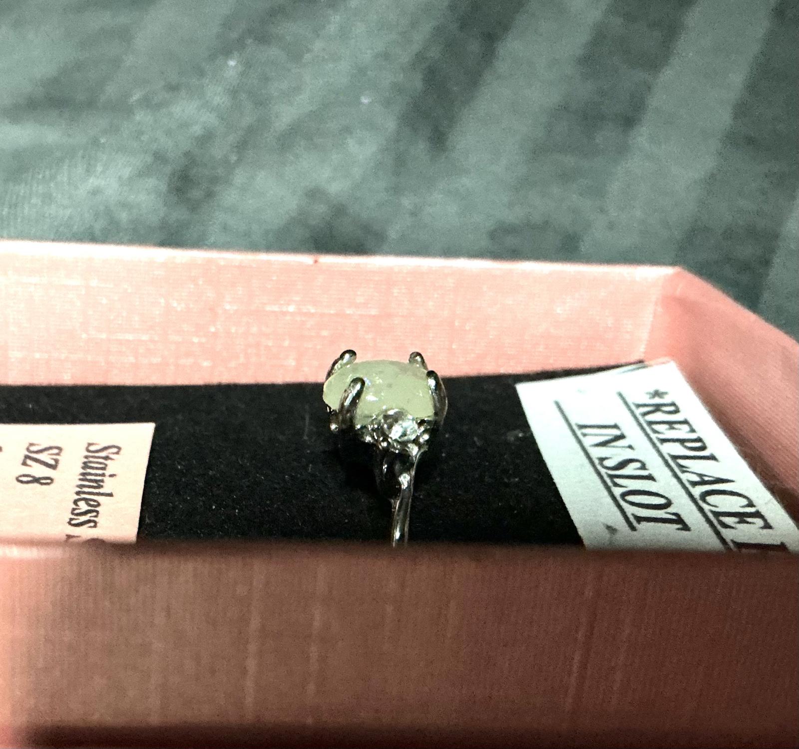Size 8 ring new with tags from VV. Stainless steel, multicolored crystal similar to opal. Reflective colors are peach , greeen , yellow , orange . With crystal baguettes flanking it. Very pretty.