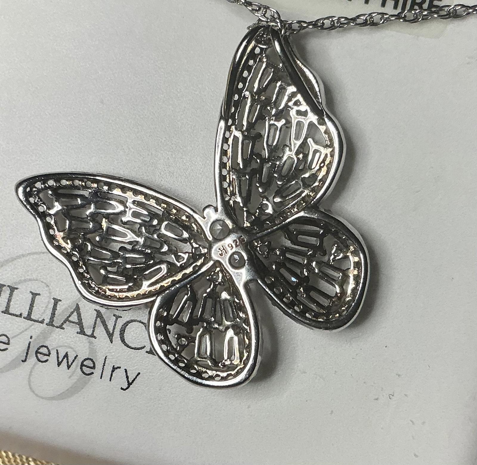 Big, beautiful butterfly necklace. Sparkling white sapphires throughout. It is set in sterling silver, stamped. Top wings are 1” apart. Chain is 17.5”. From Brilliance Fine Jewelry.