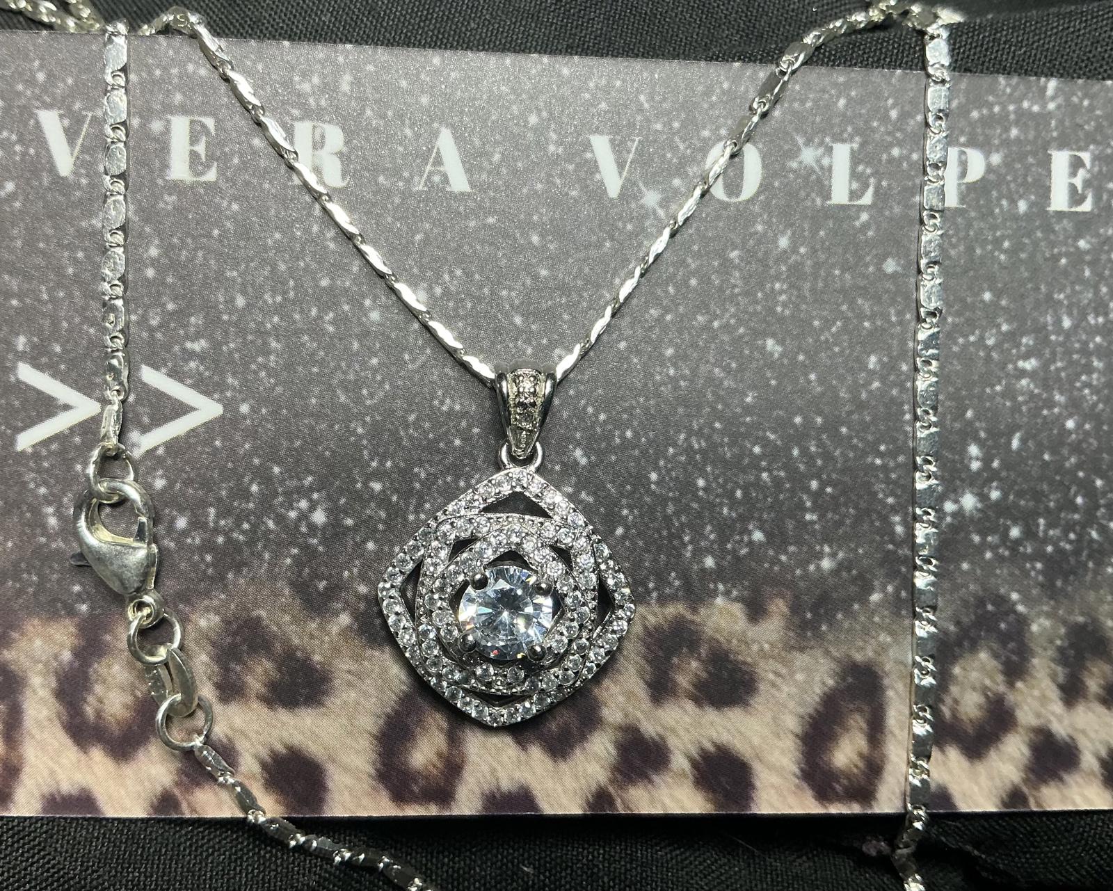 White sapphire , heated, set in sterling silver. Elevate your accessory collection with this stunning Vera Volpe necklace featuring an intricately designed pendant. The centerpiece showcases a brilliant, sparkling white sapphire surrounded by delicate, shimmering white sapphire baguettes, that radiate elegance. Perfect for any occasion, this necklace adds a touch of sophistication to both casual and formal outfits. Chain is sterling silver also. 17.5”.