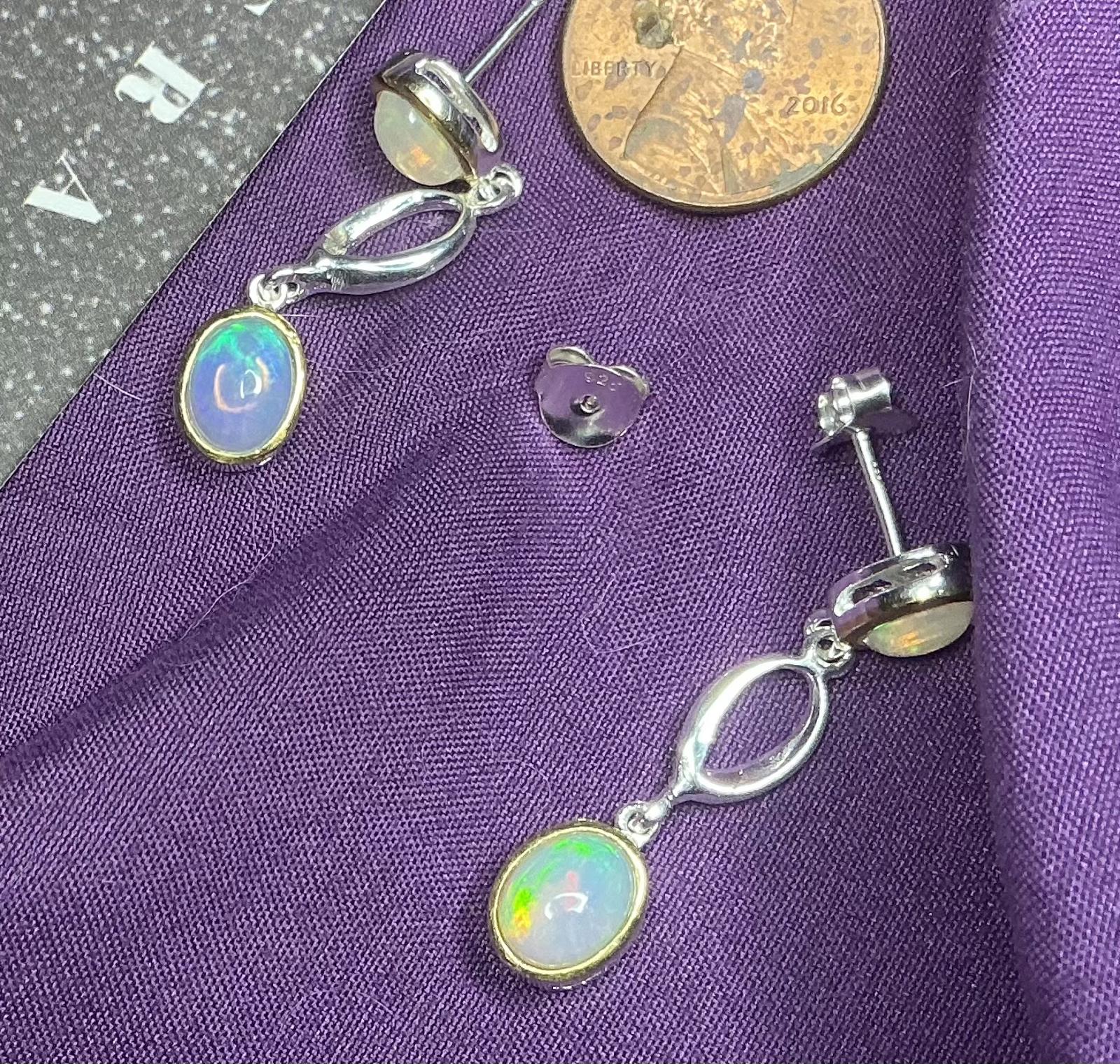 Discover a stunning pair of drop earrings featuring genuine opals in a beautiful sterling silver setting, stamped. Opals are surrounded by a frame of gold fill. These earrings showcase luminous opals that reflect an array of colors; blue , green , pink , beige ….., perfect for adding a touch of elegance to any outfit. Posts, 1.5”. Top Opal is 1ct. The bottom Opal is 1.5ct. Key features include: