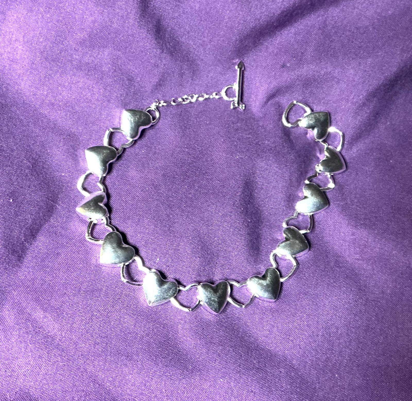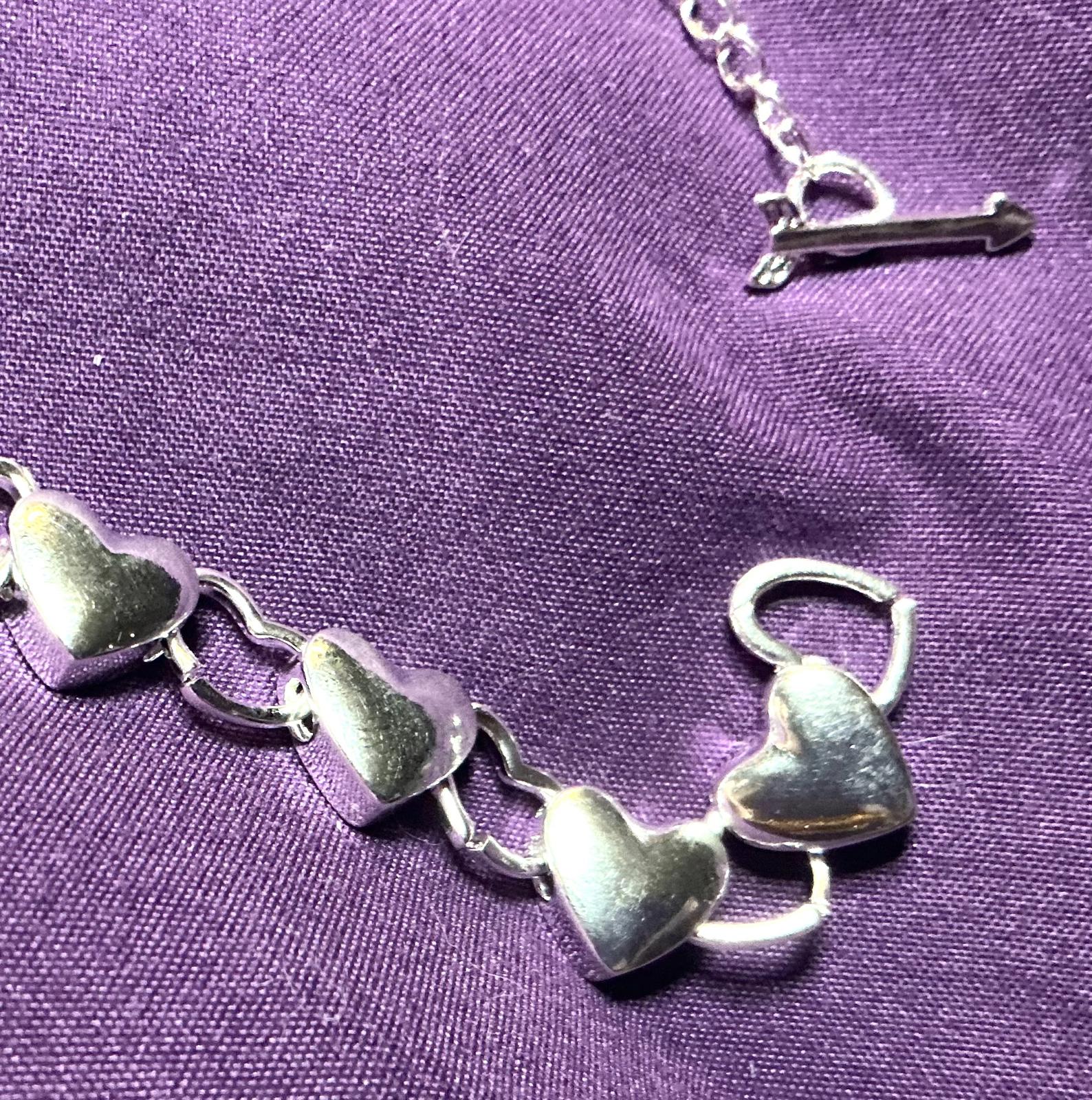 Silver filled heart bracelet. 8.5”. Crafted with a delicate design, this bracelet features a series of interlinked hearts, symbolizing love and affection. It is perfect for adding a touch of romance to any outfit, making it an ideal gift for a loved one or a delightful treat for yourself. From Vera Volpe. This stylish piece is perfect for both casual and formal occasions.