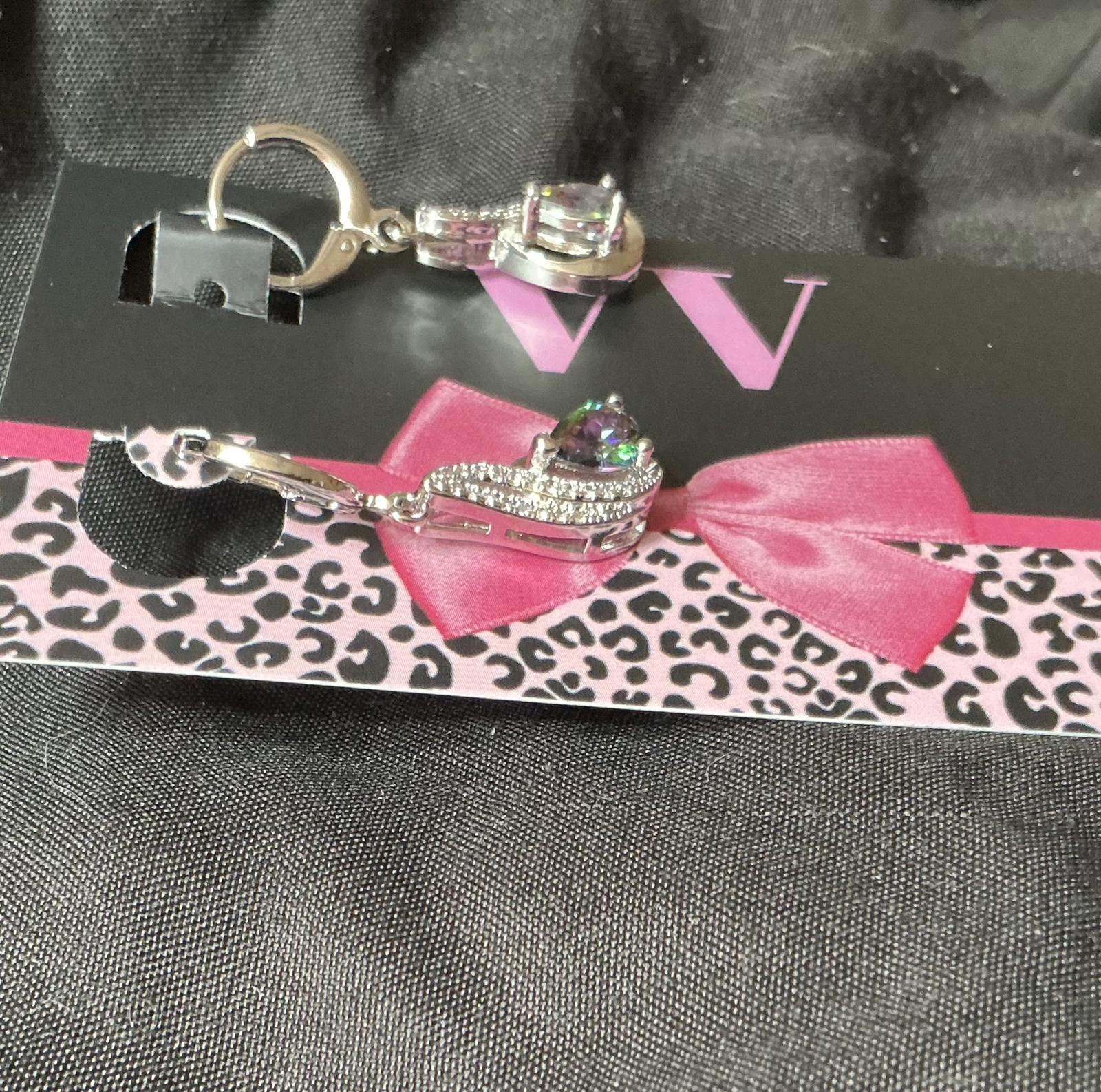 Add a touch of sophistication to your outfit with these silver filled mystical quartz earrings. Featuring a dazzling teardrop design adorned with shimmering cz and a captivating multicolor mystical quartz gemstone, these earrings are perfect for any occasion. Reflecting purple , green , maroon pink . Whether you're heading to a gala or a casual outing, you'll shine brightly with every turn. The secure clasp ensures they stay in place, allowing you to wear them with confidence. Enhance your jewelry collection with this exquisite piece, guaranteed to elevate your style. 1 1/4”.