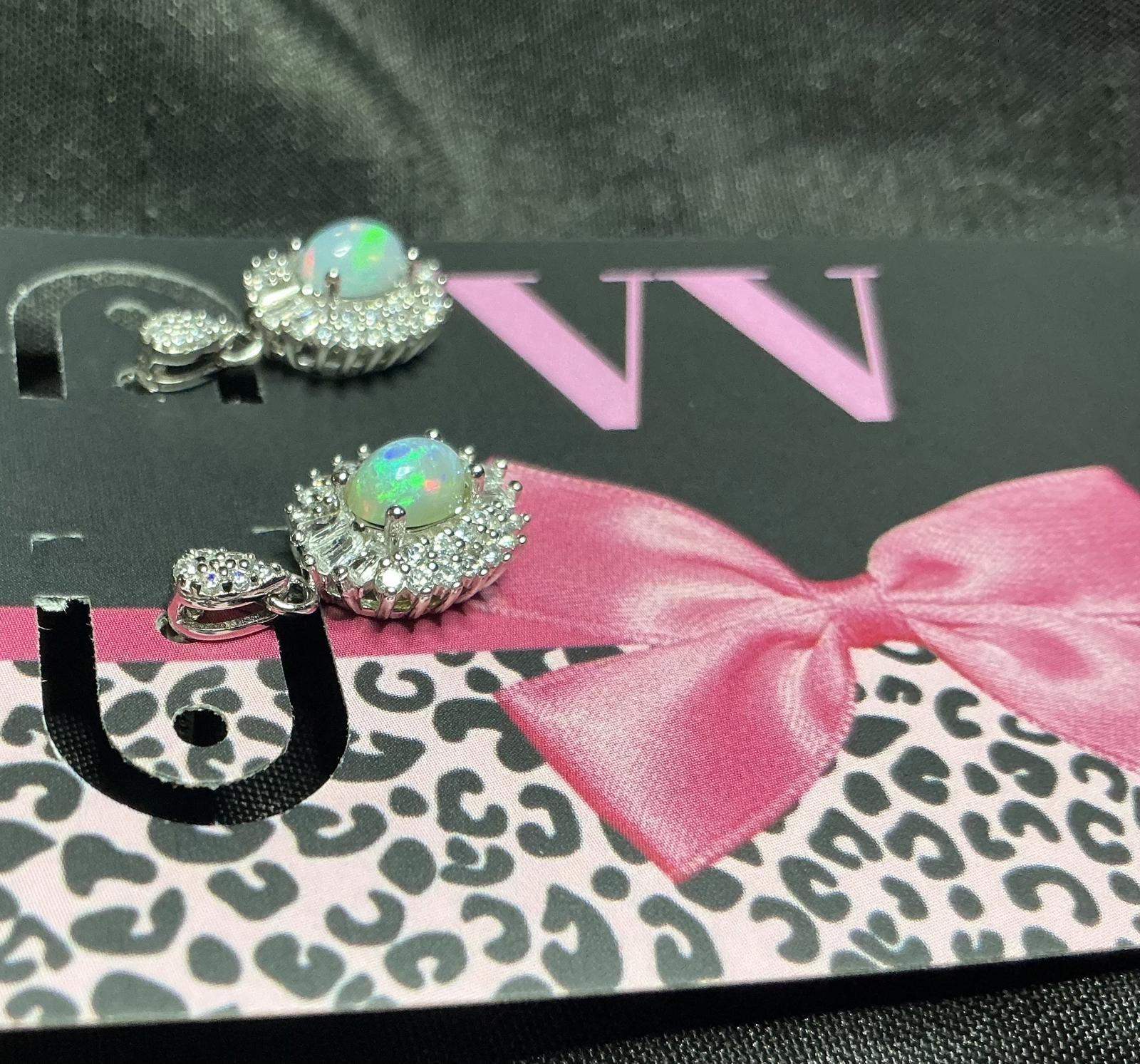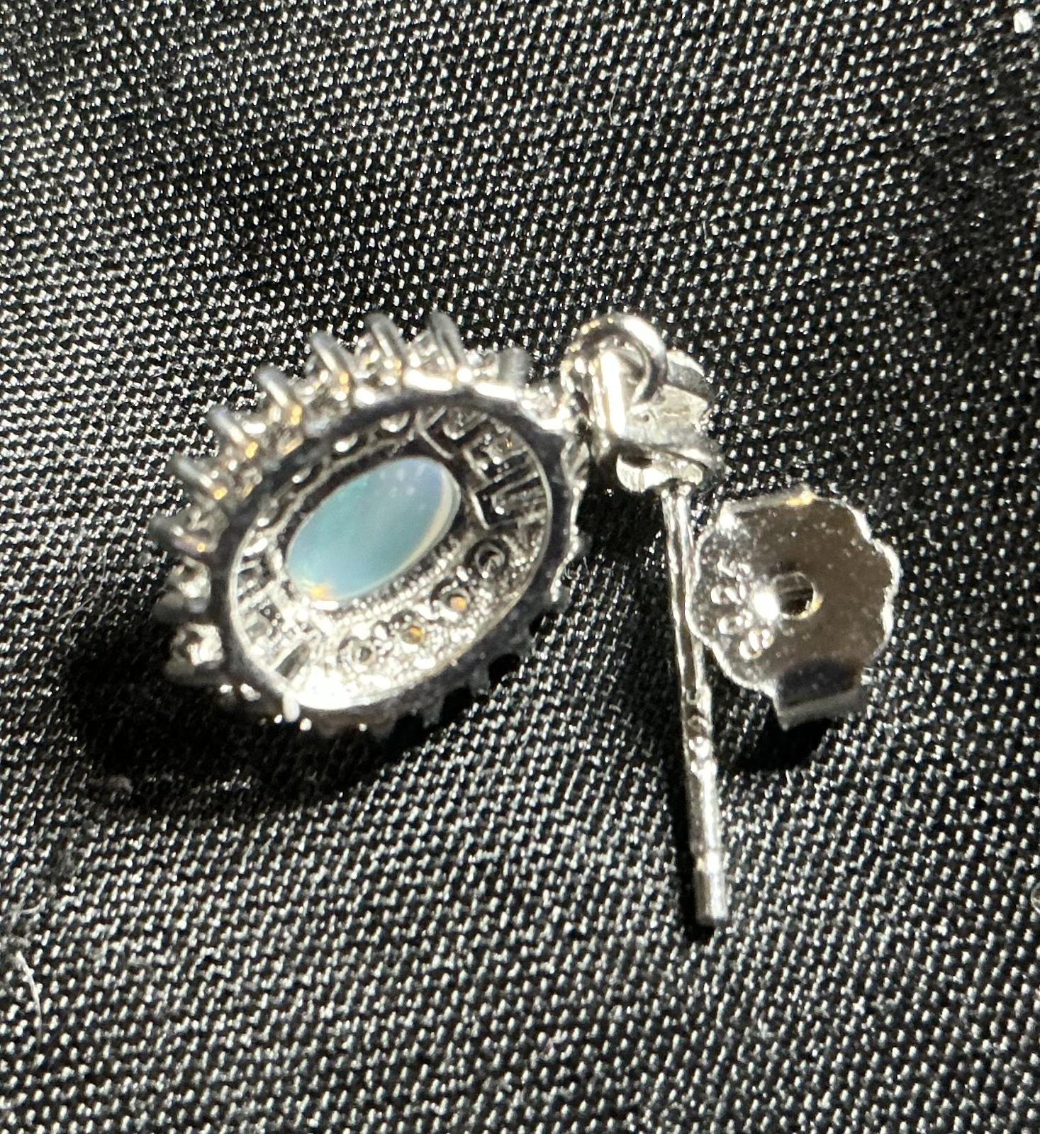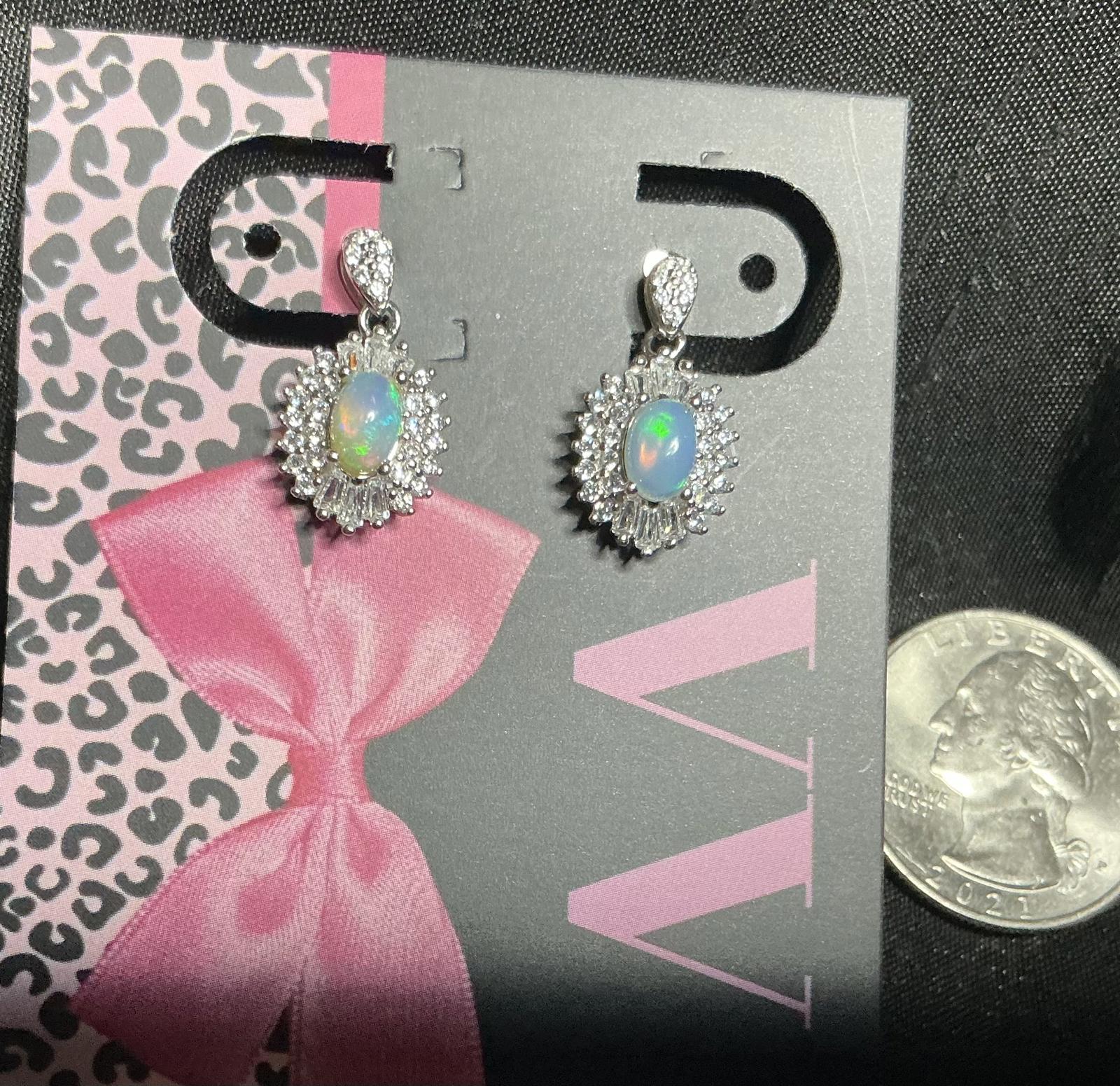 Genuine Opal earrings & diamonds approx. 1ctw together, both set in sterling silver, stamped. Add a touch of sophistication to your look with these stunning opal earrings. Featuring a mesmerizing opal stone surrounded by sparkling diamonds, these earrings are perfect for both special occasions and everyday wear. Crafted with a secure backing for a comfortable fit, they shine beautifully in any light. Perfect for gifting or treating yourself to something special. 1.5”.