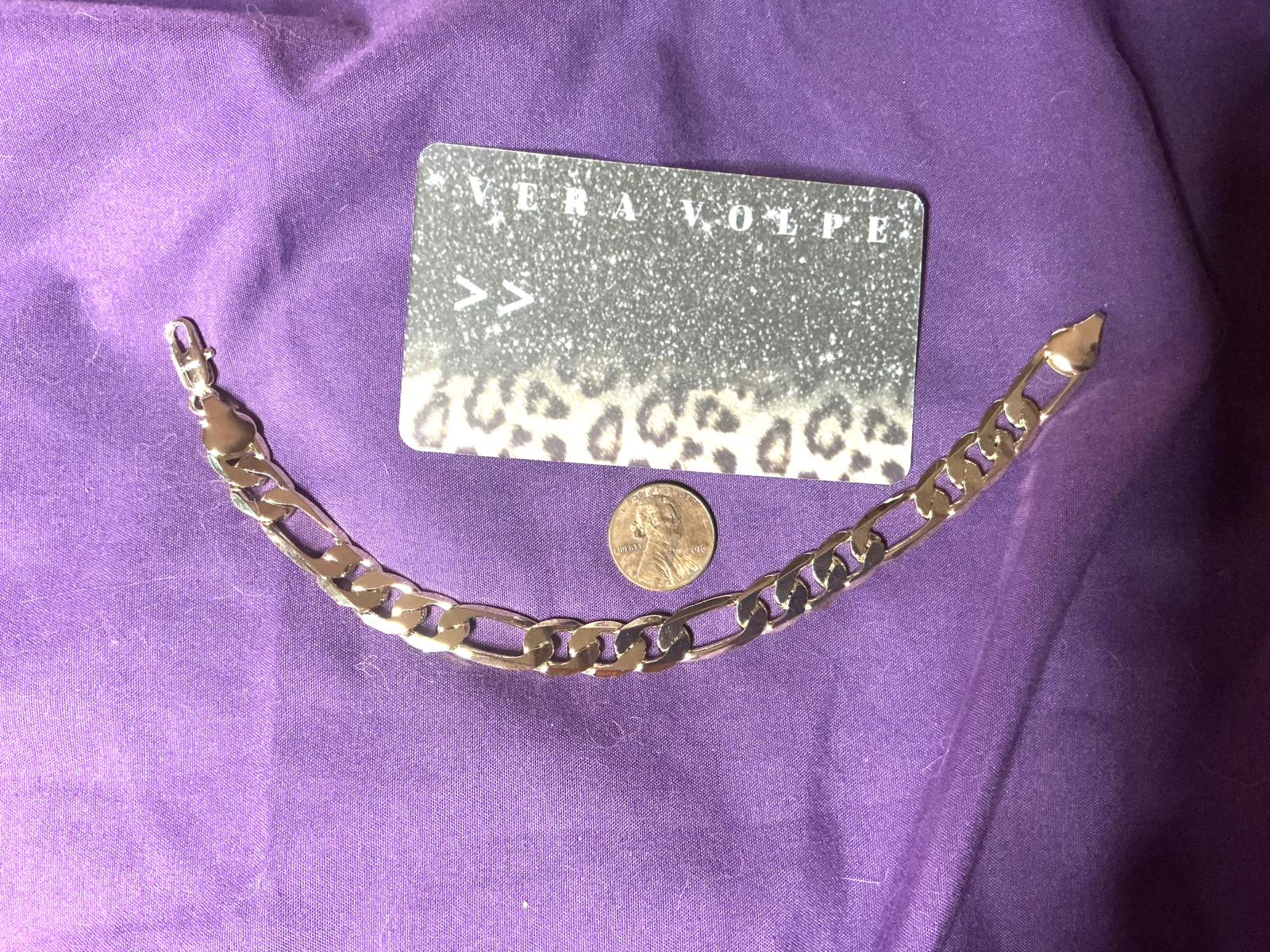 Elevate your accessory game with this stunning gold chain bracelet from Vera Volpe. 18k plated Figaro style. 8”L x 11mmW, stamped. This piece features a bold, chunky link design. Perfect for both casual and formal occasions, it is versatile and stylish. Crafted with high-quality materials, the bracelet is marked with a 'CH18K', indicating its luxurious gold finish. It also has a secure lobster clasp to keep it in place.- Unique chunky link design- Brand: Vera Volpe- Secure lobster clasp- Ideal for various occasions