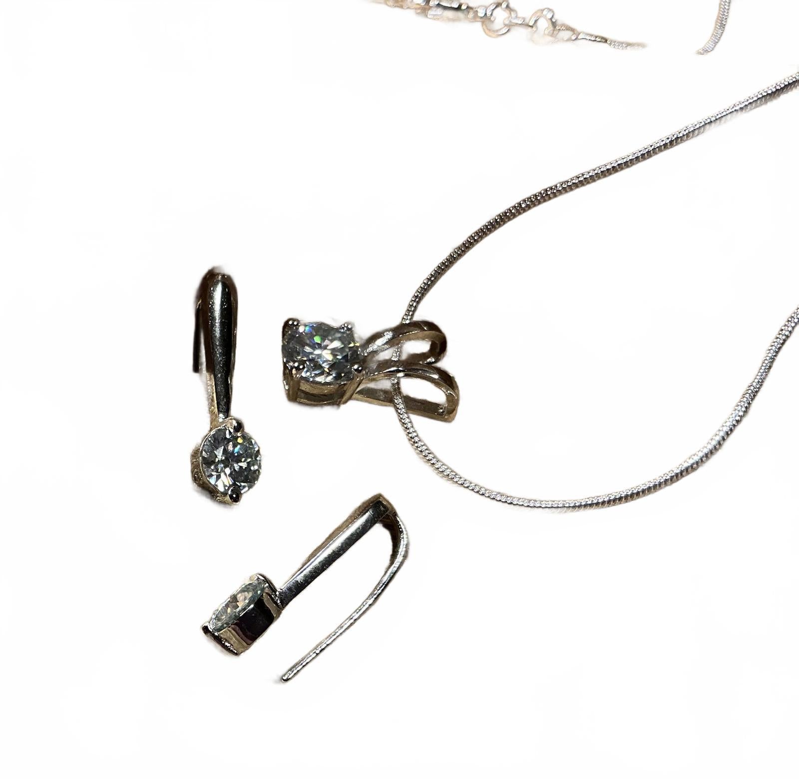 Elegant sterling silver moissanite diamond necklace and matching moissanite diamond earrings set , all stamped 925, from Vera Volpe. The earrings are approx 1.2ct each Moissanite Diamonds. And each whole earring is 1” long. The necklace pendant is approx 2.4ct Moissanite Diamond. The length of the sterling silver chain is 23”. Beautifully clear diamonds. FYI: April birthday set.
