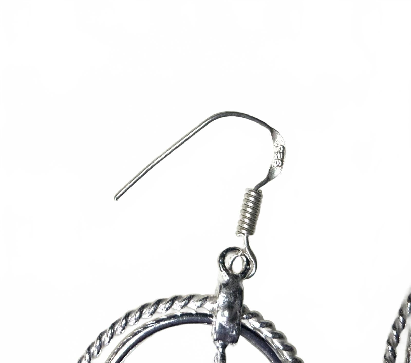 Elevate your accessory game with these stunning sterling silver earrings featuring a captivating blue spinal stone. The intricate design includes dual hoops: a smooth outer ring and a twisted inner circle, adding depth and elegance. Stamped. Perfect for both casual outings or special occasions, these earrings are lightweight and comfortable. By Vera Volpe, 2”. Key features include: