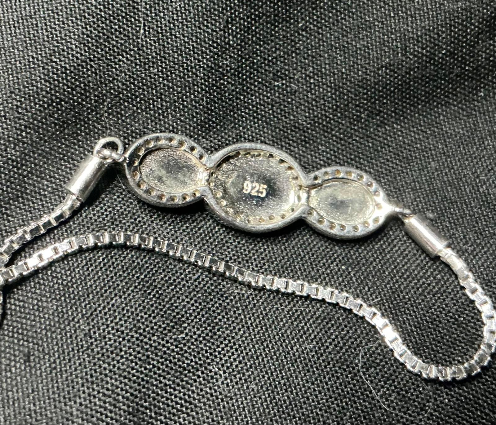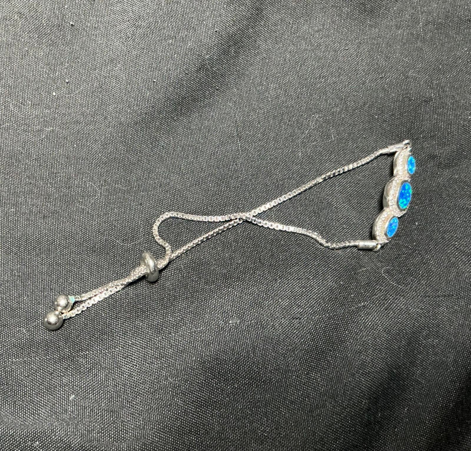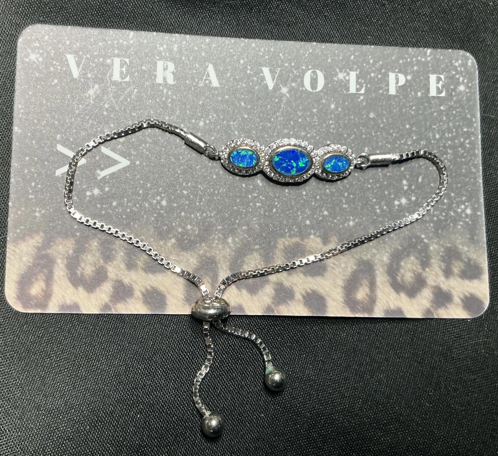 Opals surrounded with cz crystals. Elevate your style with this stunning Vera Volpe bracelet, featuring a captivating design adorned with three radiant blue opal stones. Perfect for adding a touch of elegance to any outfit, this 7” adjustable bracelet is made with durable sterling silver metal and is ideal for both casual and formal occasions. CZ crystals surround the opals. Key features include: