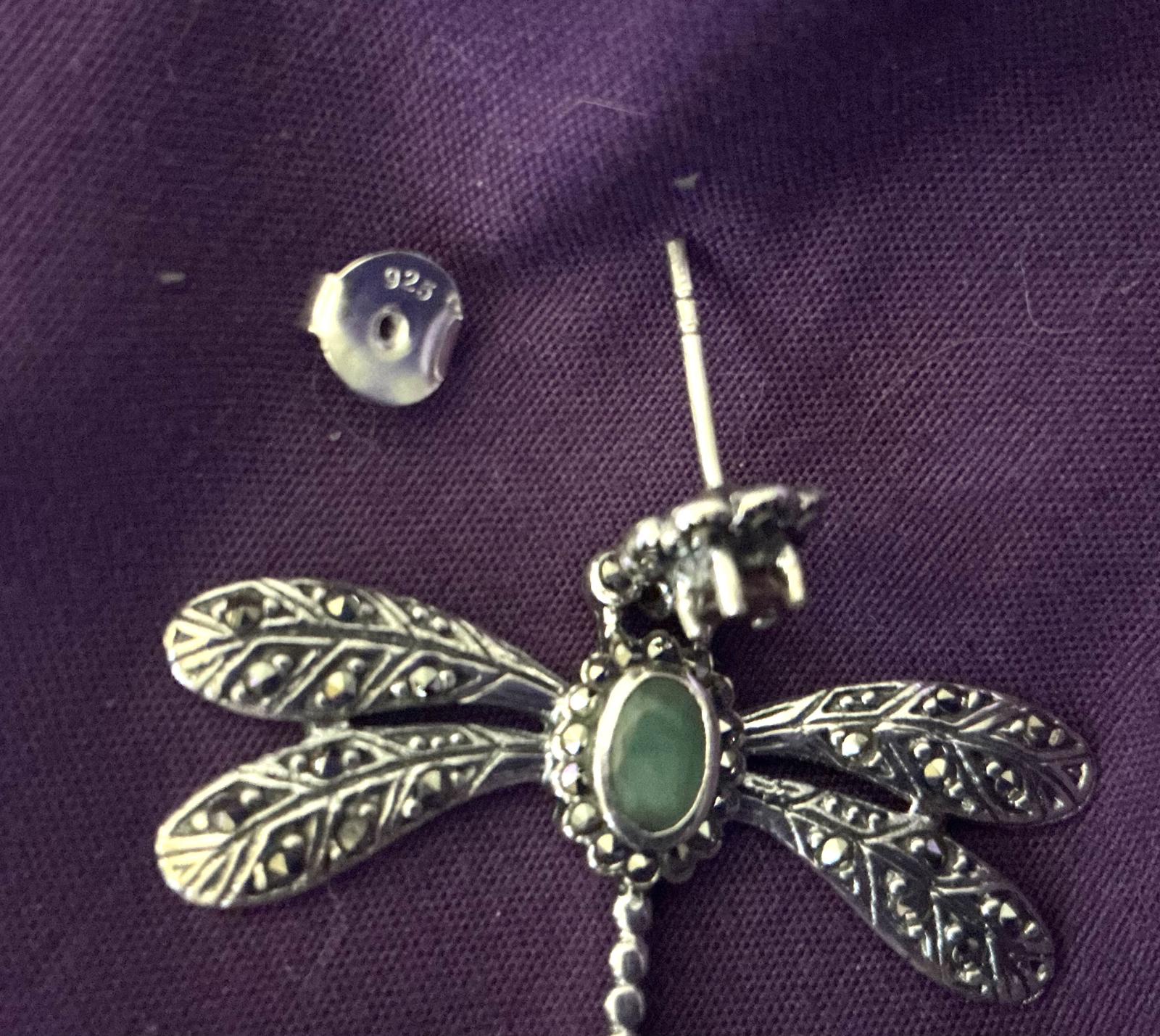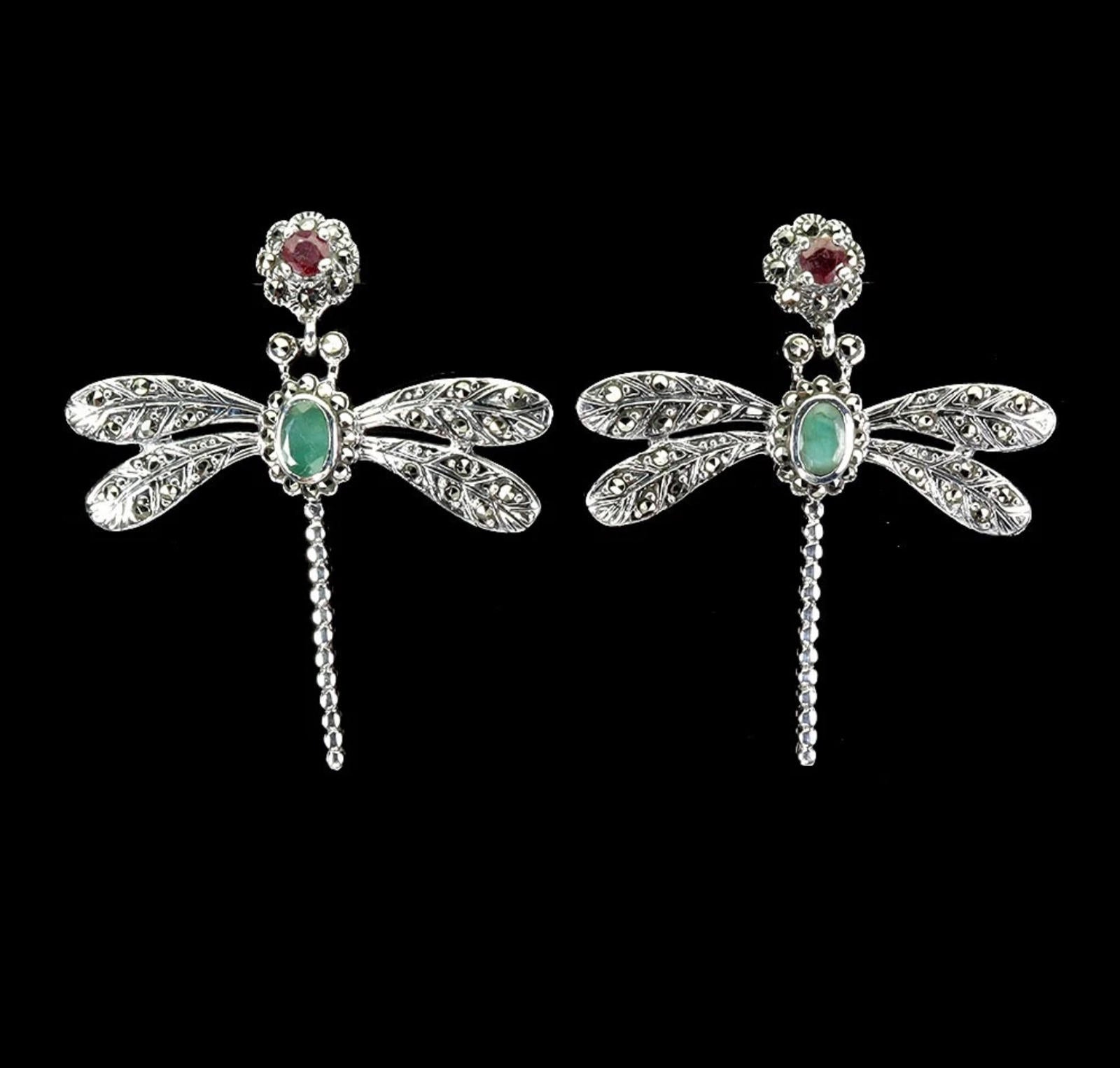 Elevate your accessory game with these stunning dragonfly earrings from Vera Volpe. 1ct. Red Ruby and 1.5ct green emerald and black marcasite on the wings. Set in sterling silver, stamp. 1 3/4” L x 1 1/2”W. Perfect for any occasion, they add a touch of whimsy and elegance to your outfit. Key features include: