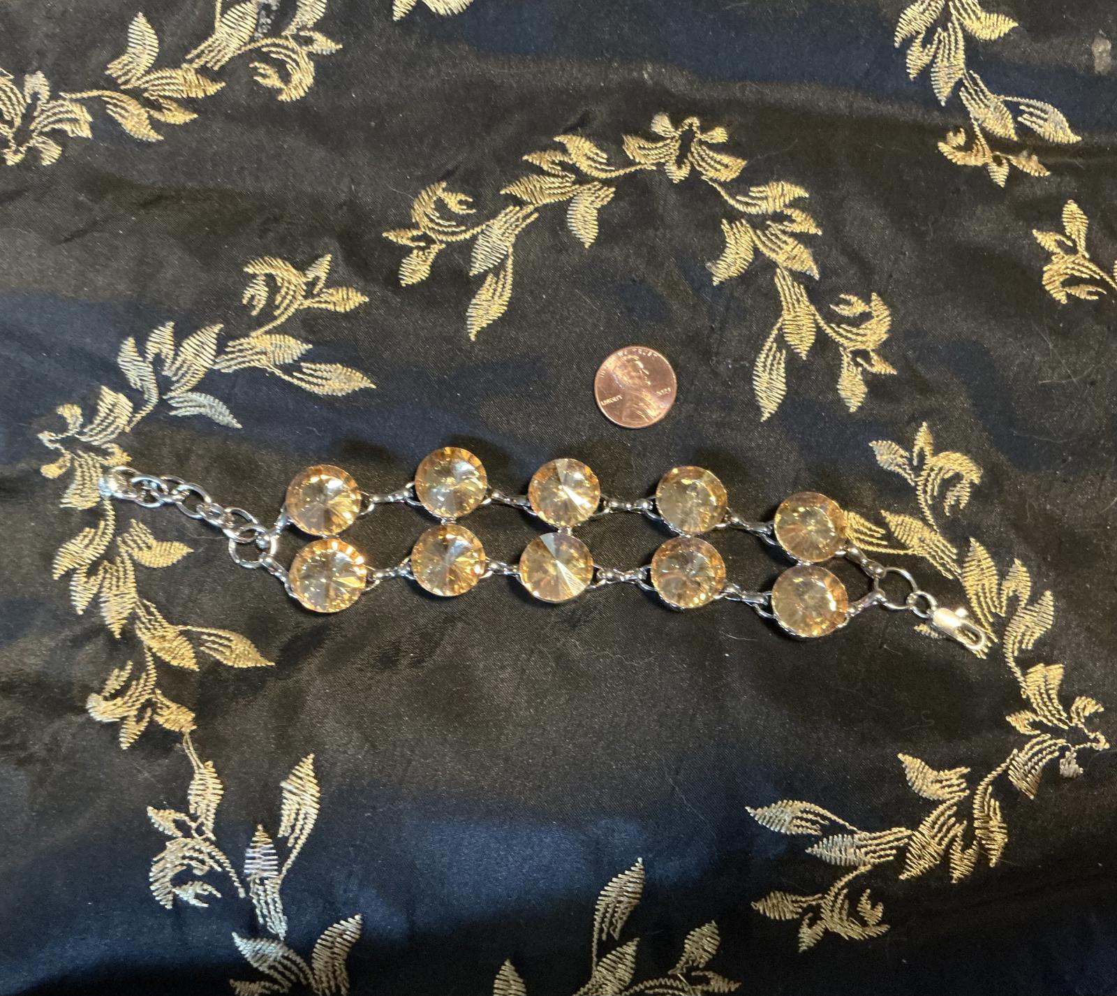 Add a touch of elegance to your jewelry collection with this stunning stainless steel crystal bracelet, 7.5”. Yellow / orange / amber double row faceted crystals. This exquisite piece features sparkling round crystals set in a stainless steel chain, reflecting light beautifully. Perfect for both casual and formal occasions, this bracelet is sure to elevate any outfit. Key features include: