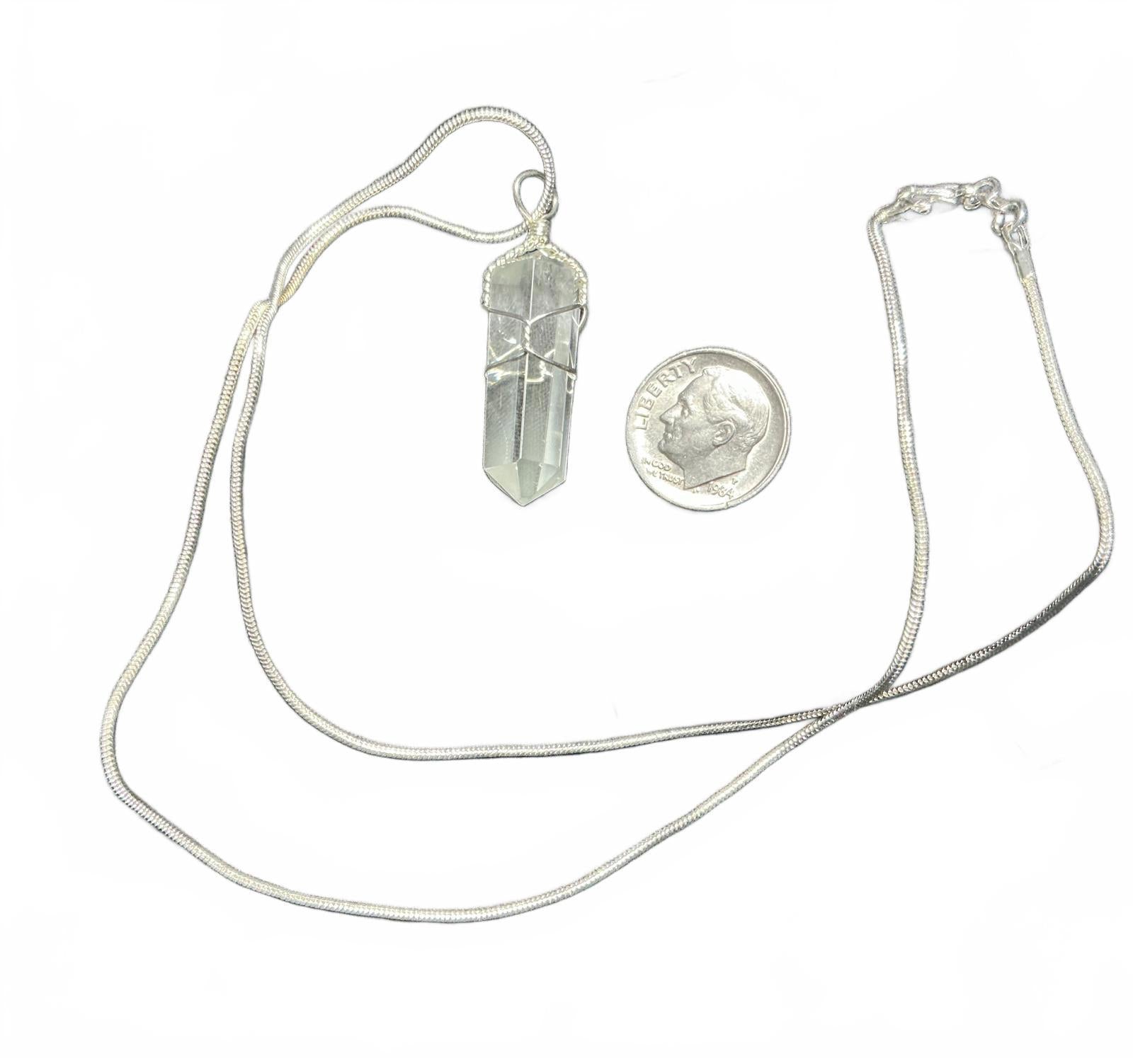 Elevate your accessory game with this stunning Clear Quartz Crystal Necklace. Perfect for both everyday wear and special occasions, this necklace features a beautifully polished clear quartz crystal pendant expertly wrapped in silver. The sleek sterling silver chain , 20”, complements the pendant effortlessly. Clear quartz is known for its healing properties and strengthening intuition. making it an ideal gift for anyone interested in wellness.
