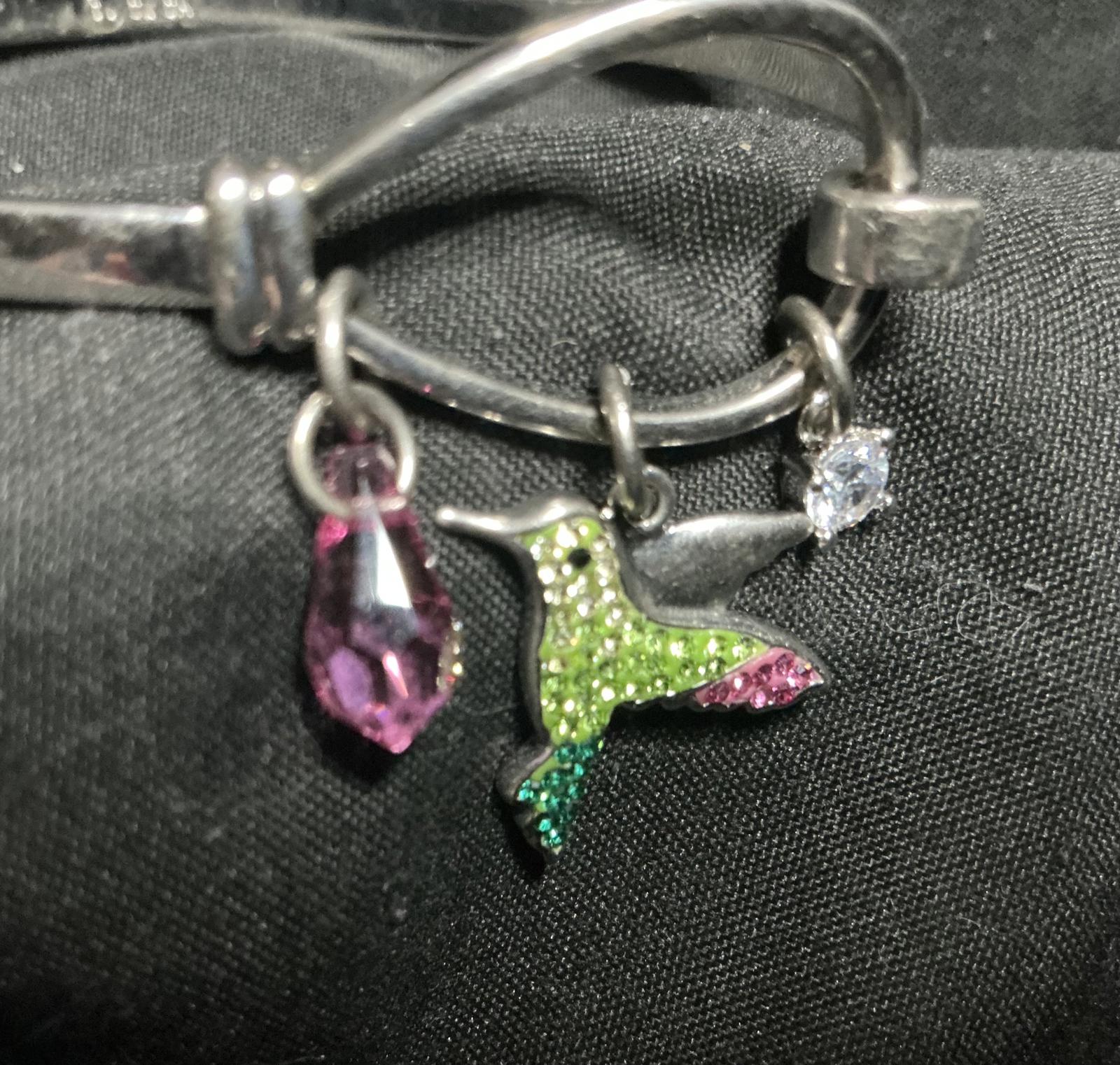 Stainless steel bangle cuff bracelet, cz crystals. Elevate your jewelry collection with this stunning bracelet from Vera Volpe, featuring a vibrant hummingbird bird charm adorned with sparkling green and pink CZ crystals. The bracelet is crafted from durable steel, ensuring a comfortable fit. Perfect for adding a playful touch to any outfit, this unique piece also includes a pink teardrop crystal charm and a clear cz crystal accent. Whether you’re treating yourself or searching for a special gift, this bracelet is sure to impress.