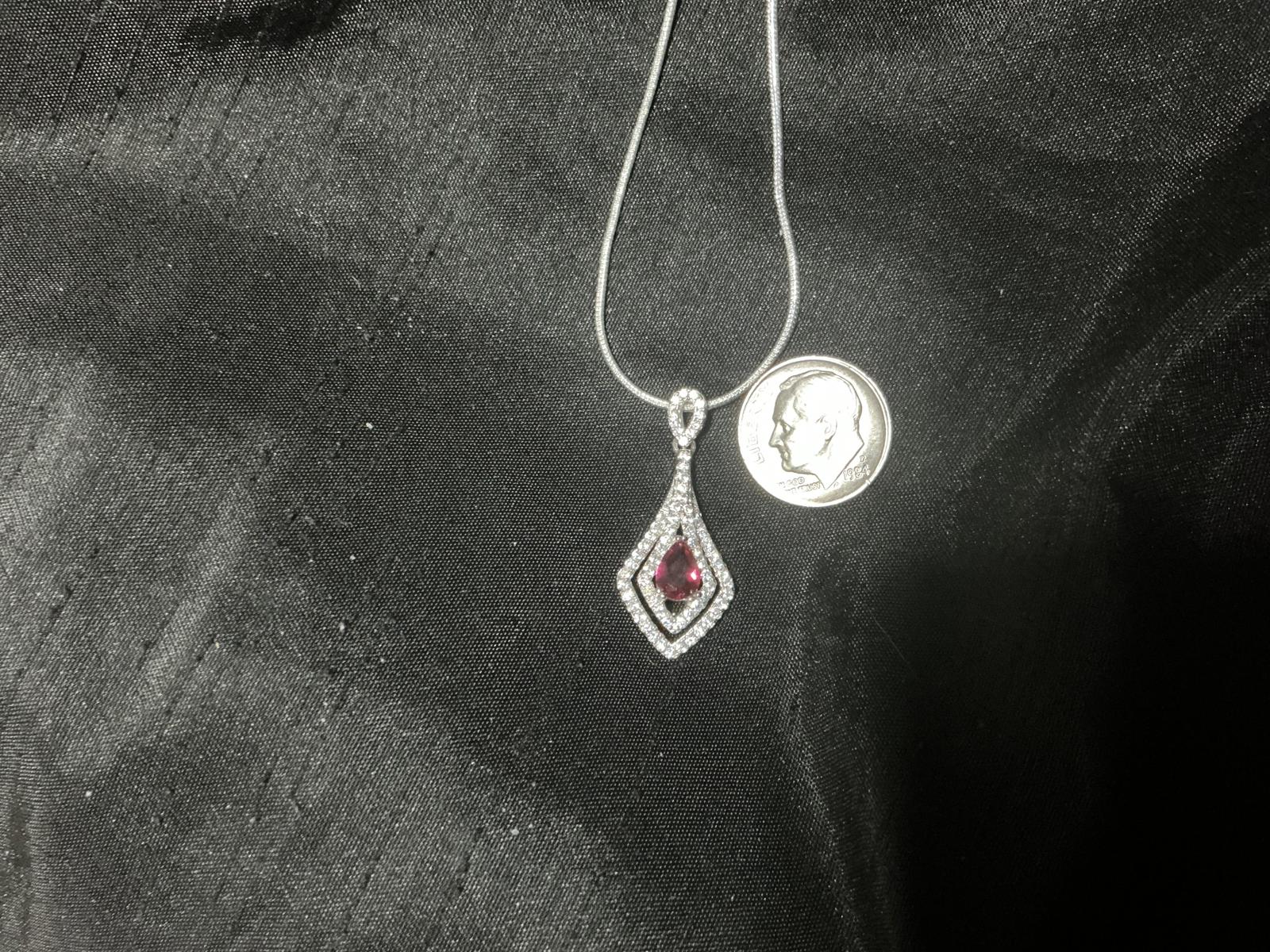 Discover the beauty of this stunning pendant necklace featuring a vibrant treated red ruby stone surrounded by white topaz. Set in sterling silver and on a sterling silver necklace, both stamped. 1ct. Ruby. Perfect for any occasion, this piece adds a touch of elegance to your attire. Key features include: